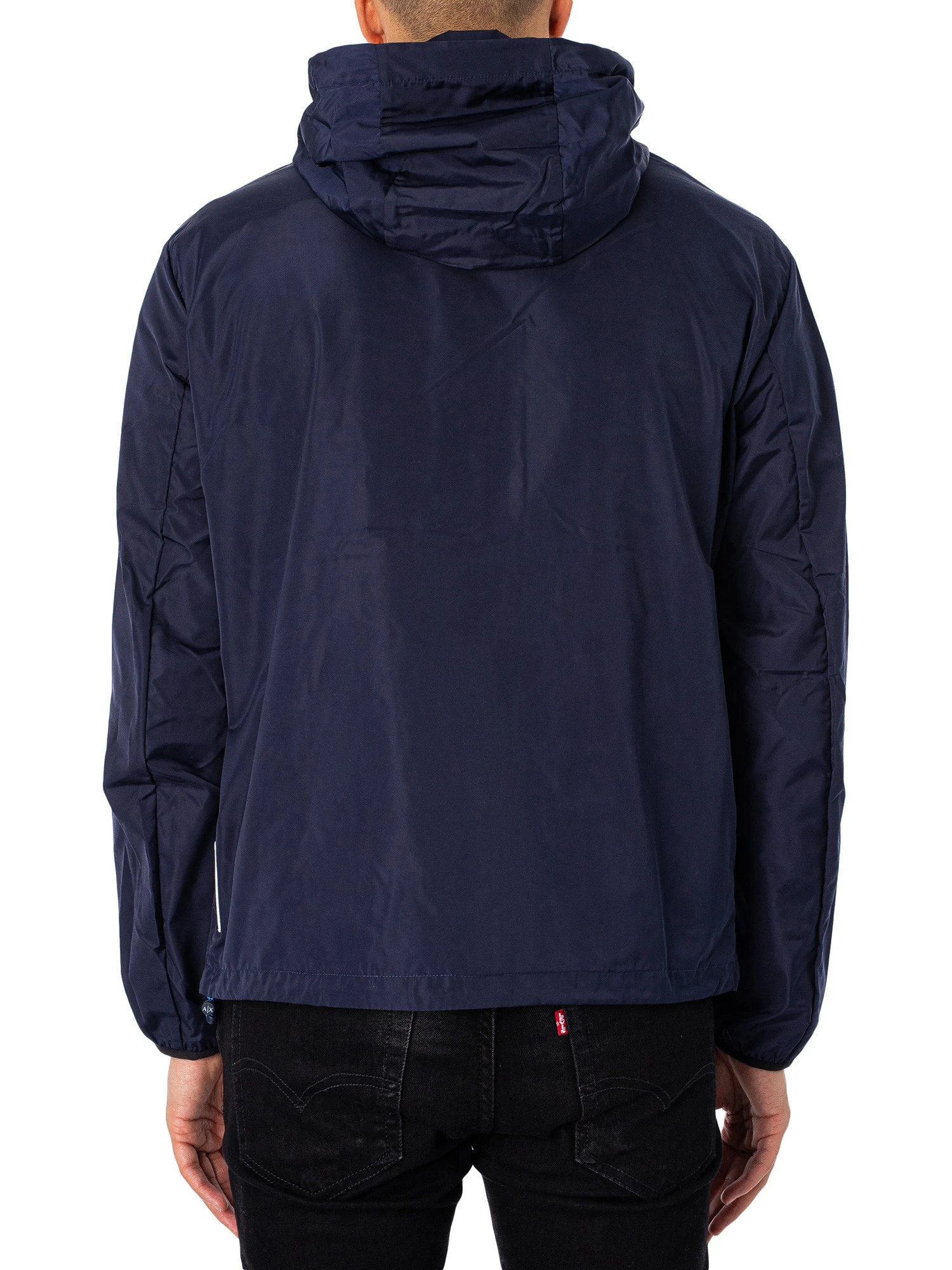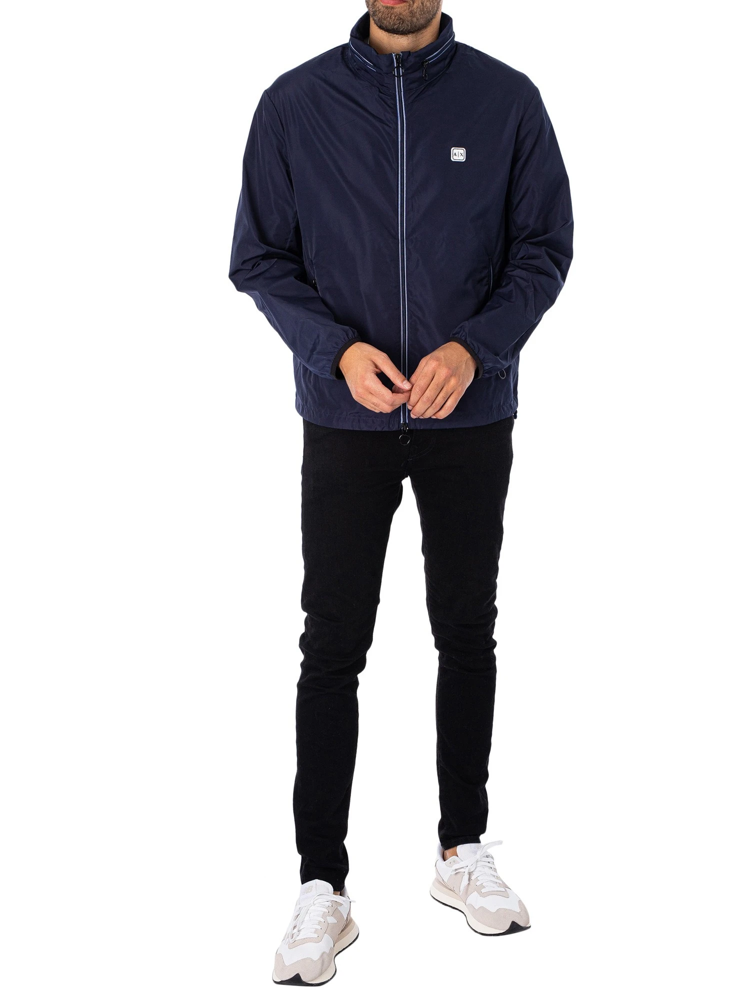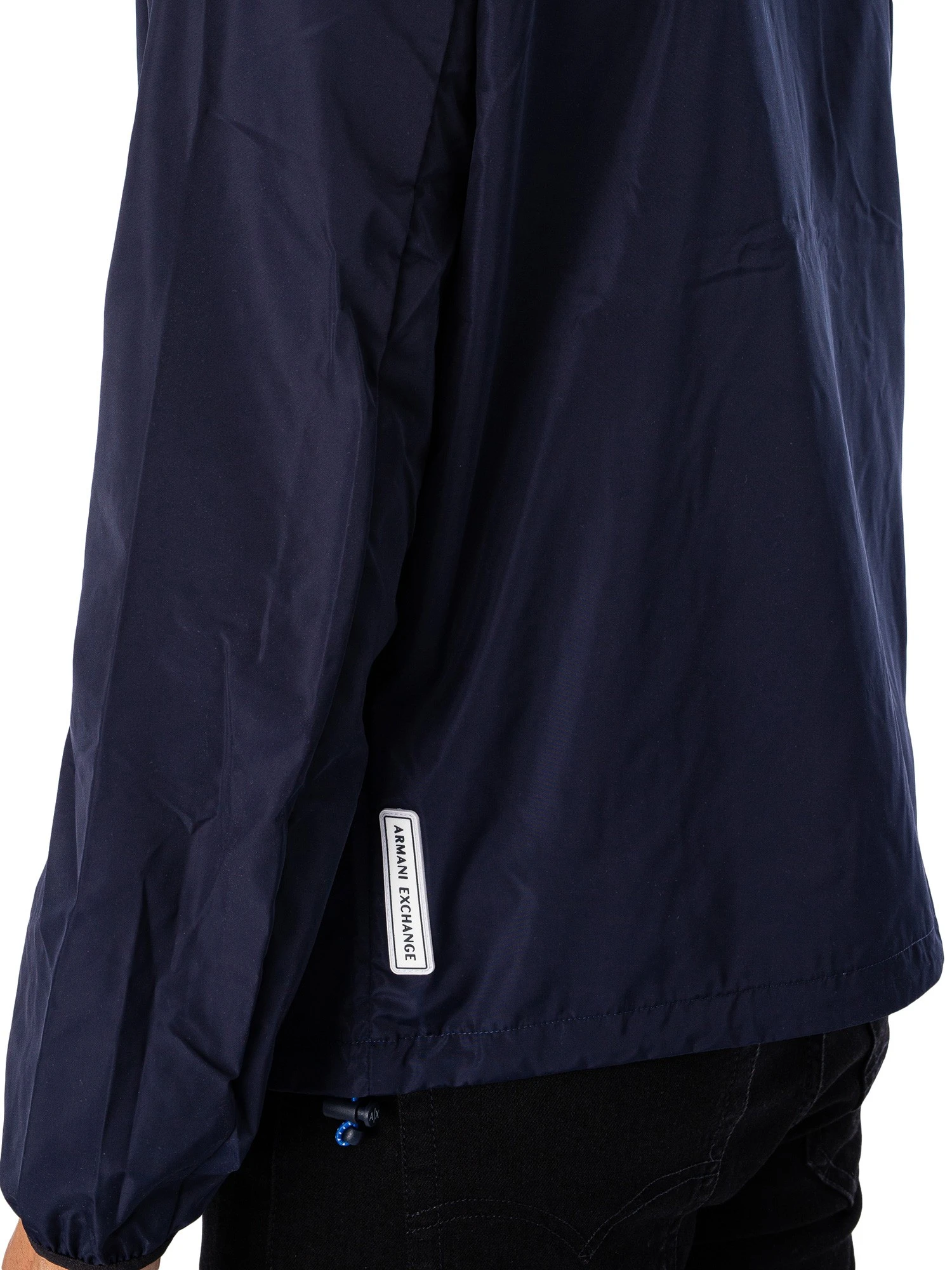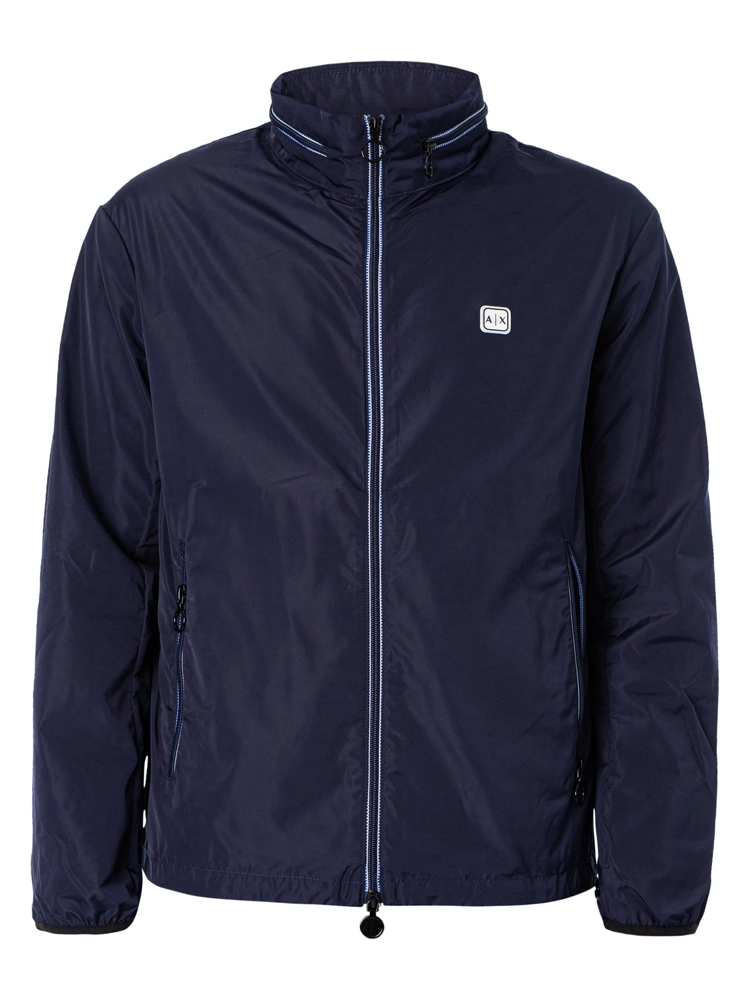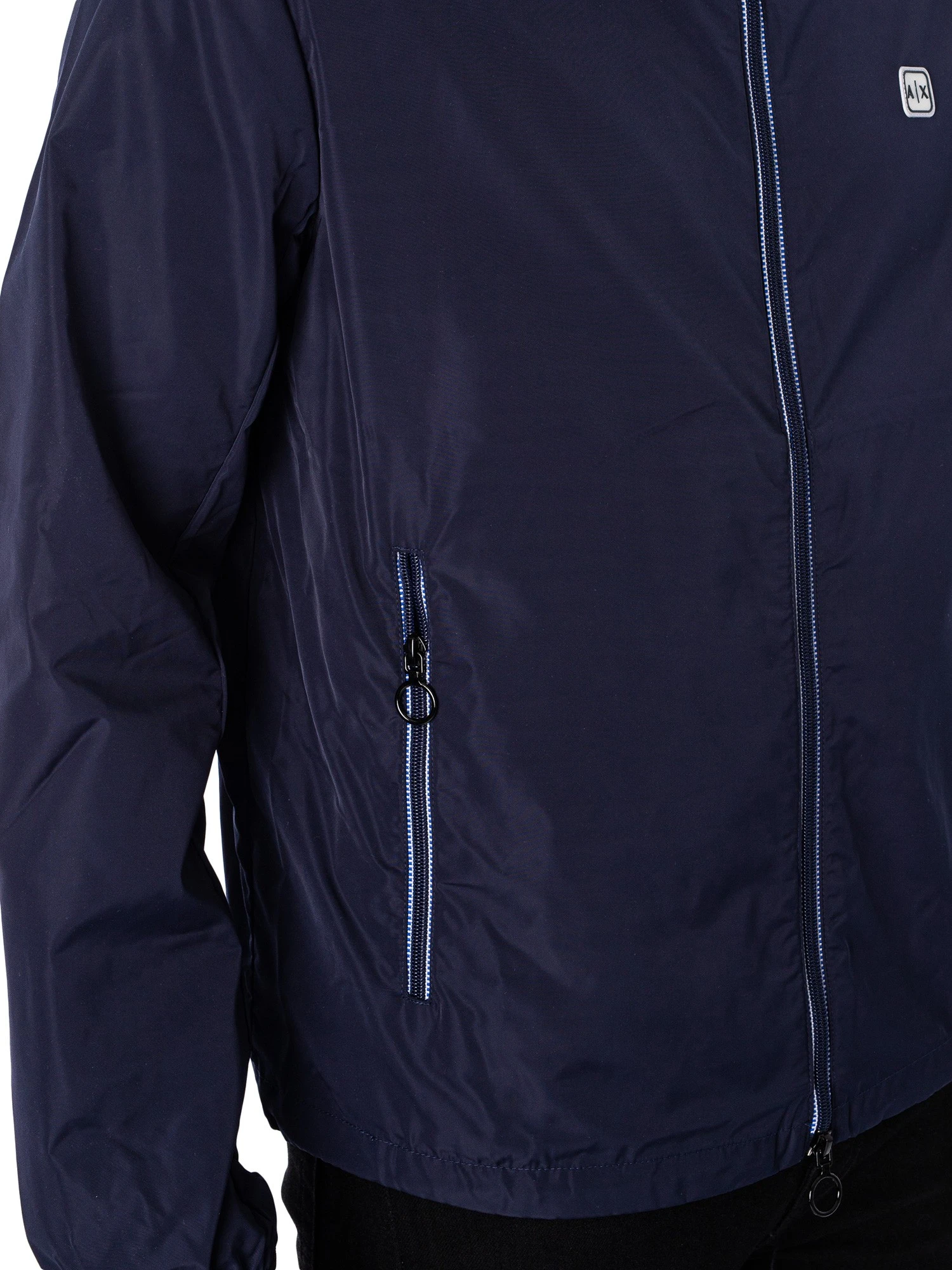 The Woven Blouson Jacket from Armani Exchange comes with a rubber left chest logo, featuring a toggle on hem and an inside zip pocket with elasticated cuffs. Coming in Navy Blazer colour, this jacket features front zip pockets and a zip away hood.