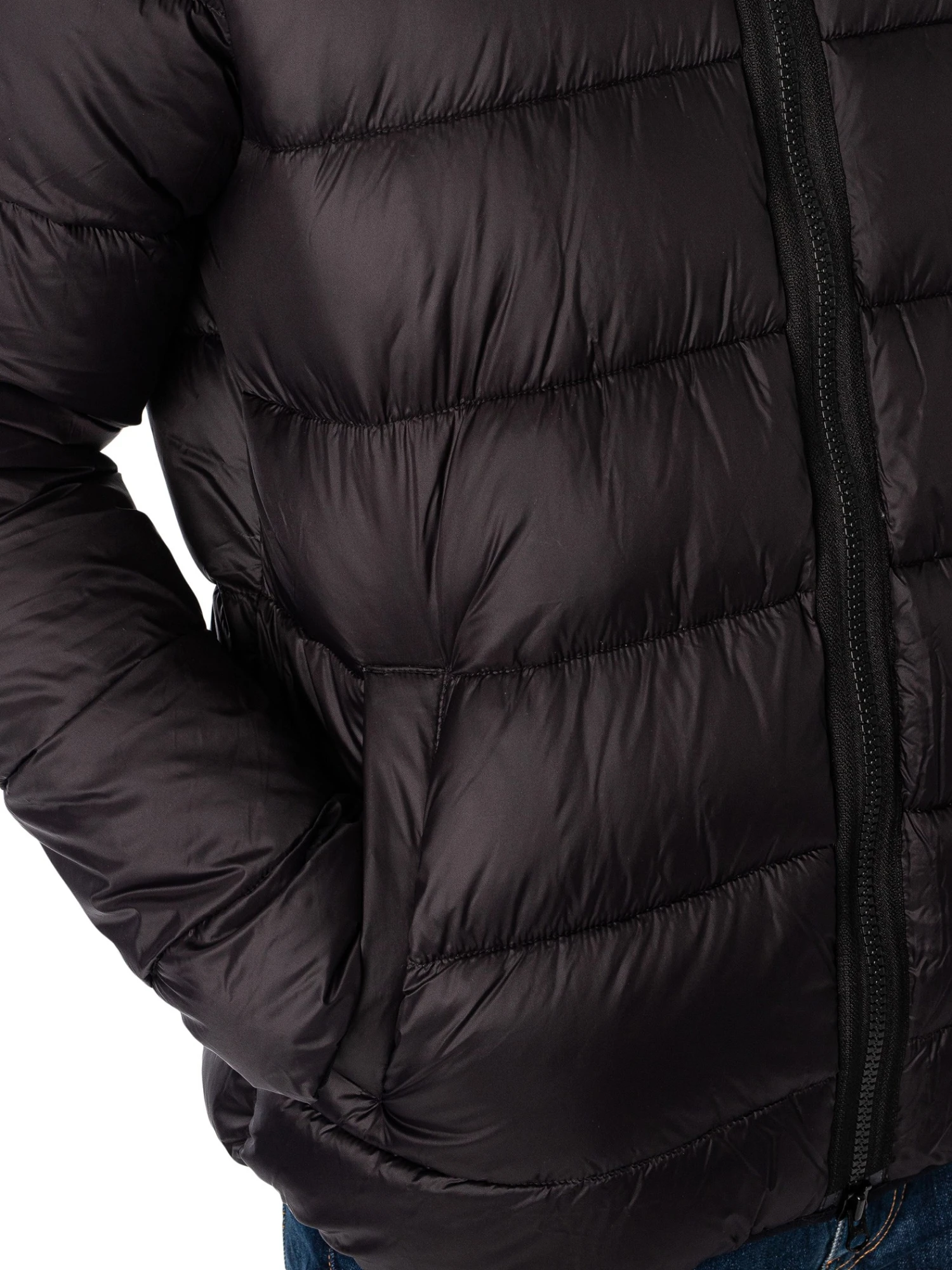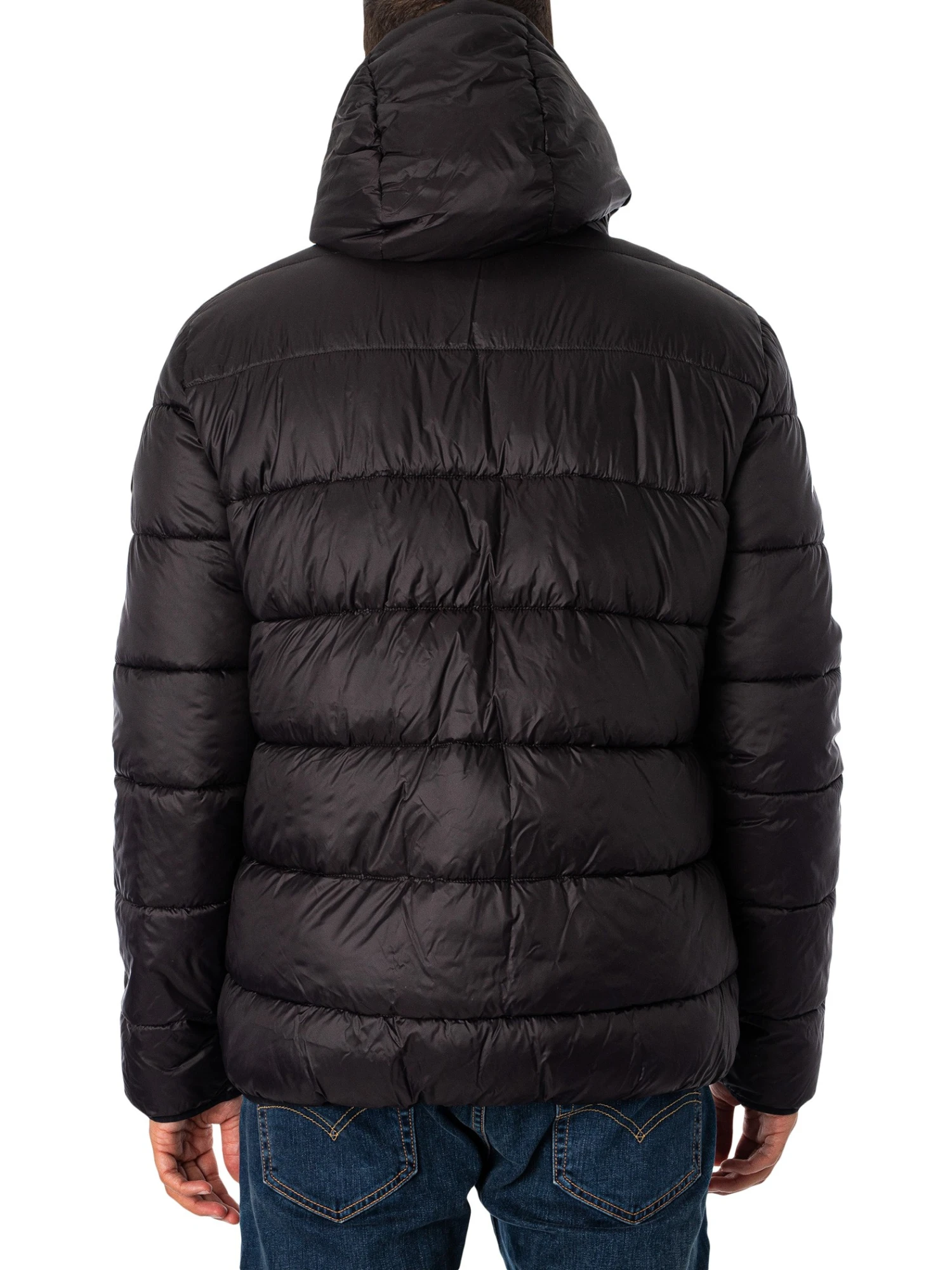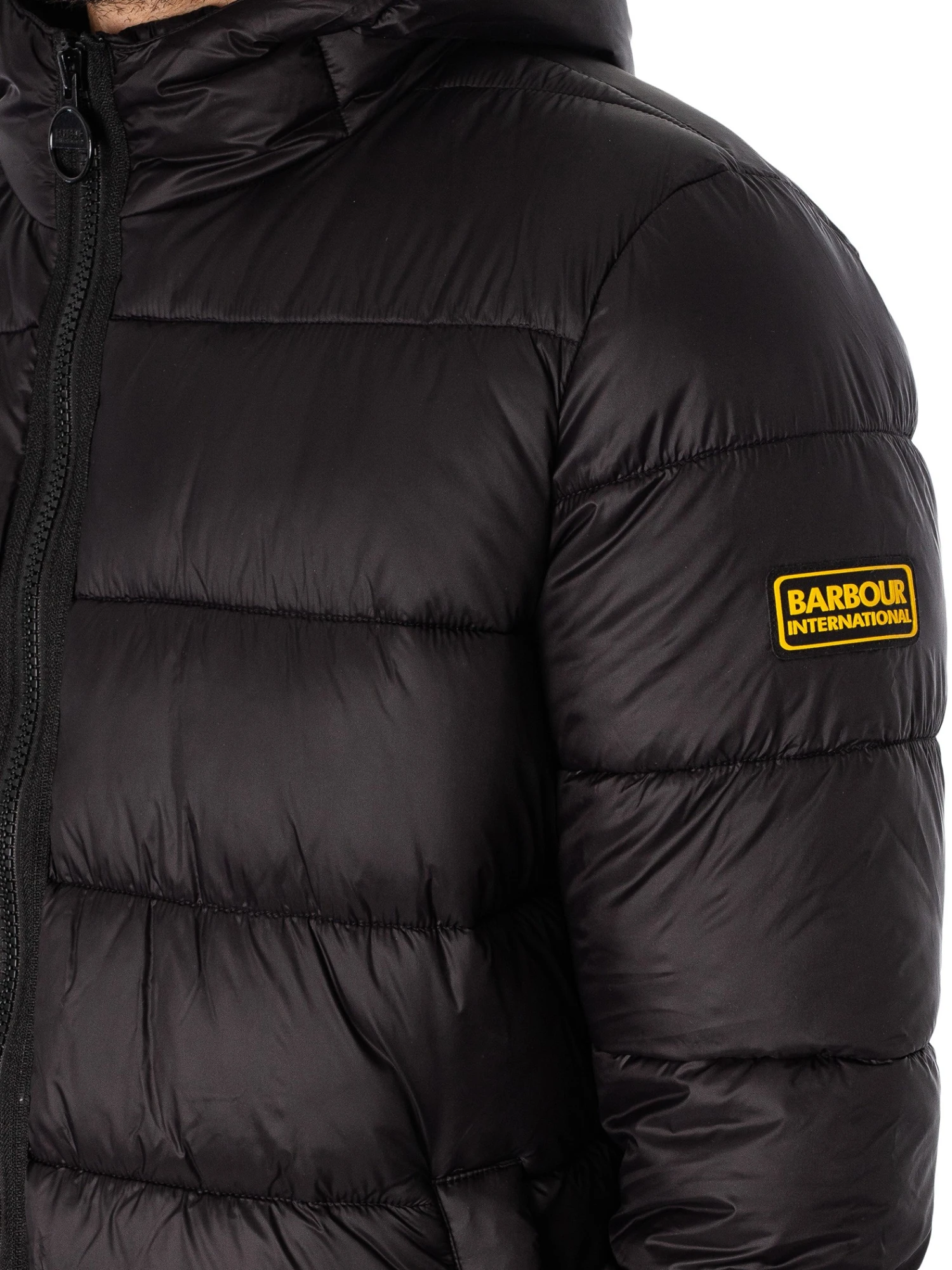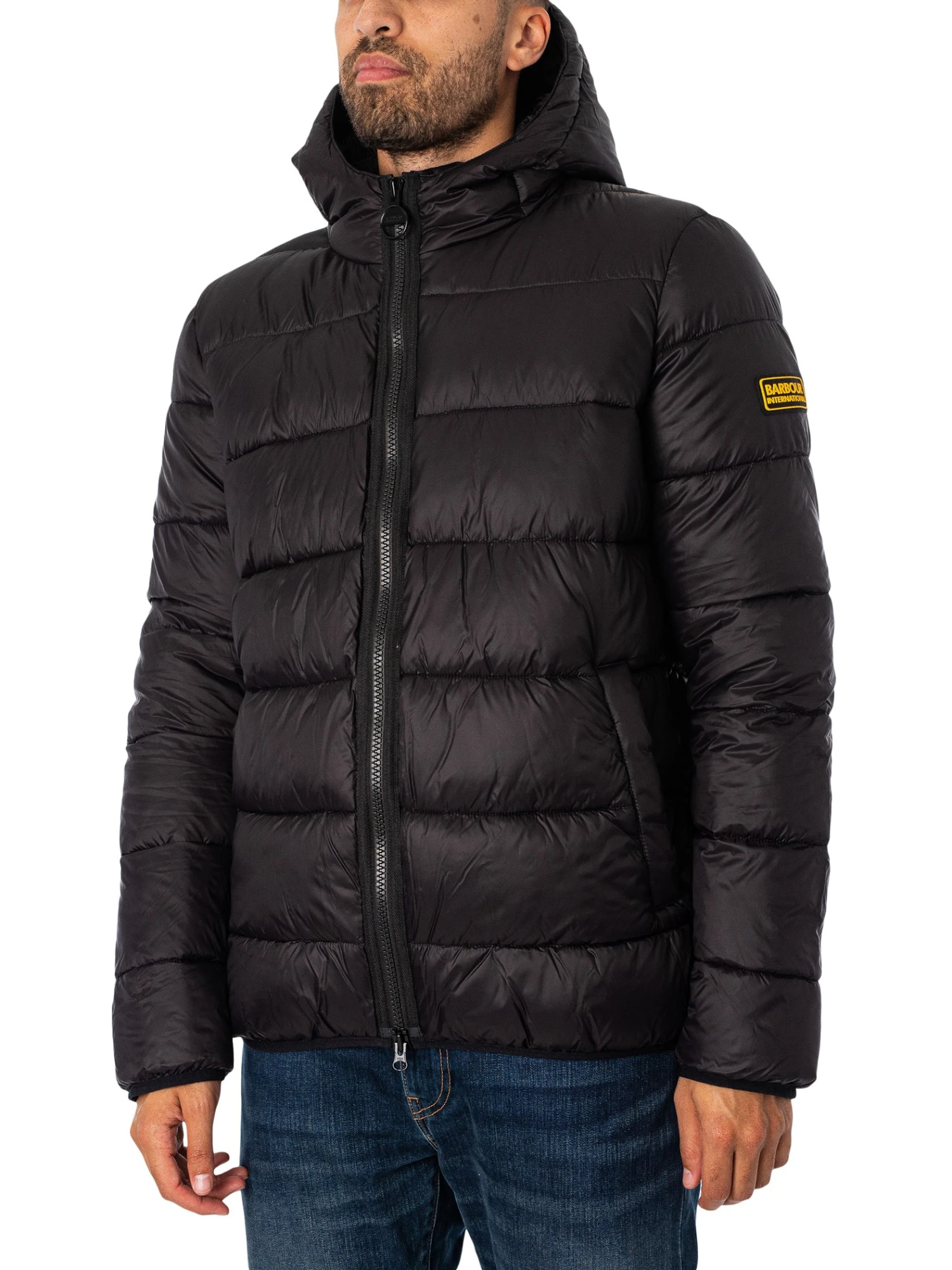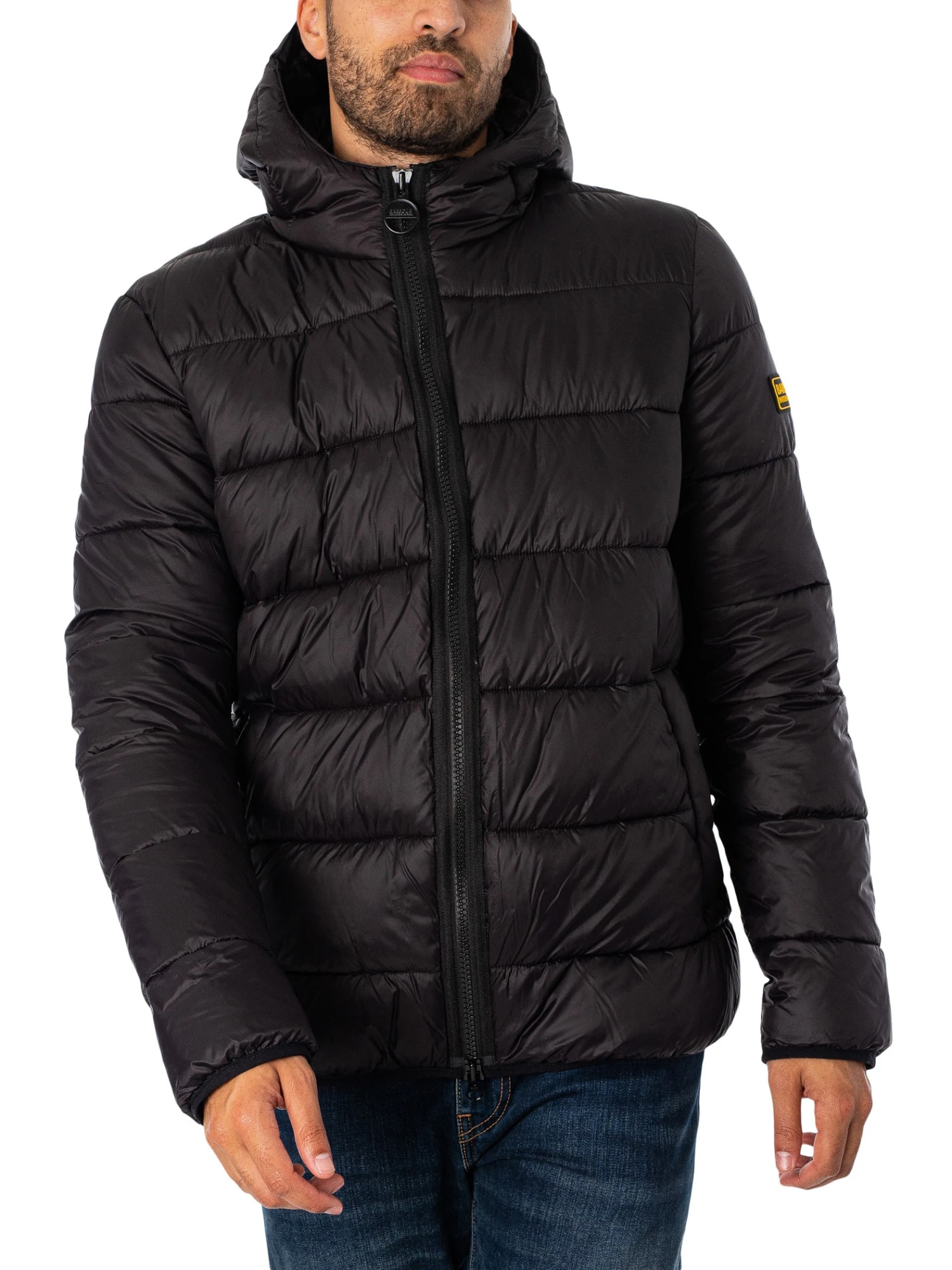 The Quilted Bomber Jacket from Barbour International comes in Black colour, featuring a branded badge on sleeve. Coming with a toggled hood, open pockets, and inside buttoned pocket, this jacket features elasticated cuffs and hem.