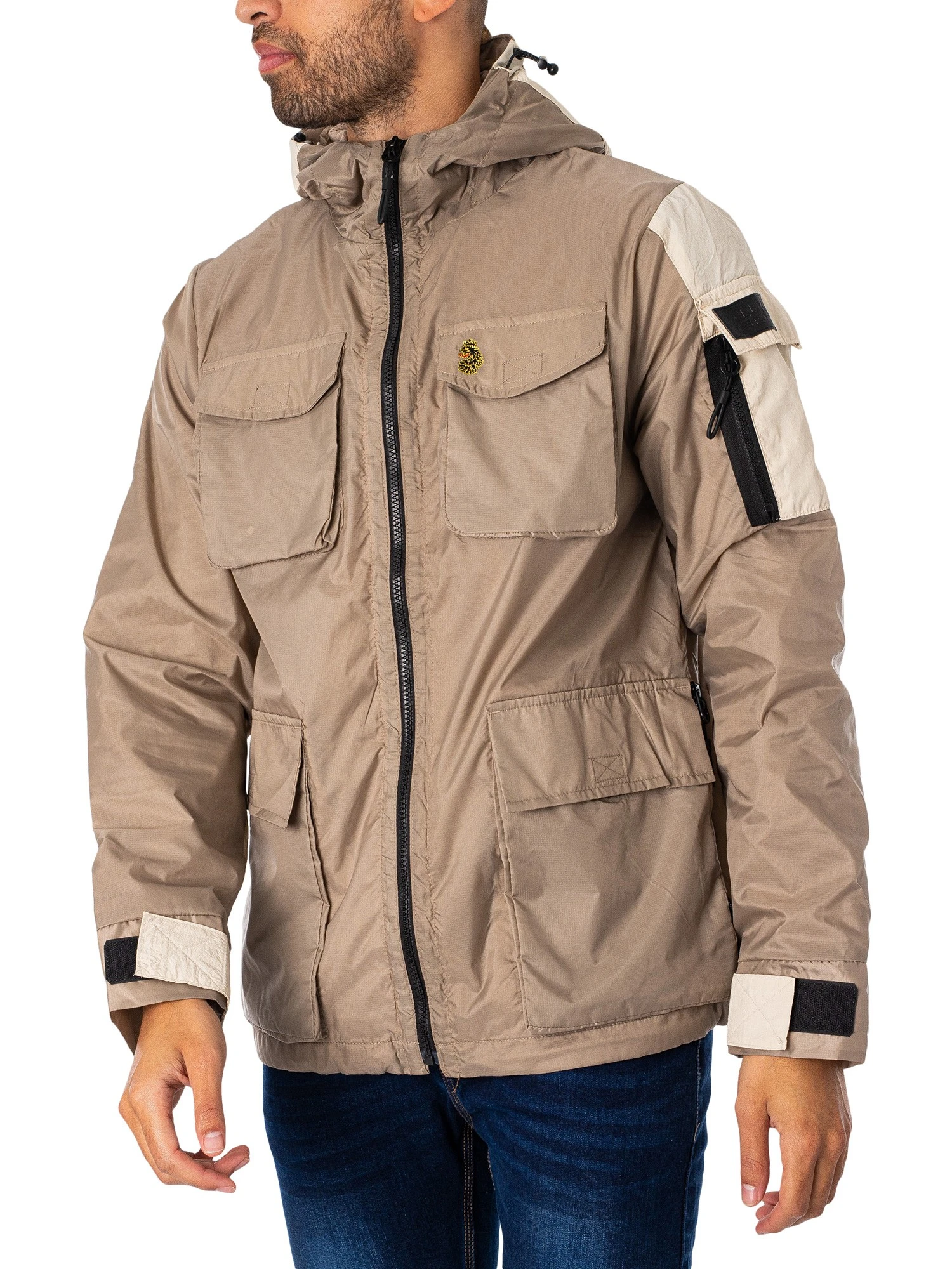 The Curation Technical Jacket from Luke 1977 comes in Ecru colour, featuring an embroidered left chest logo on pocket. Coming with front hook and loop fastener pockets, this jacket features hook and loop fastening cuffs, and front zip side pockets and a zip hood pocket. Featuring a zip closure with a branded zip and mesh inside lining, this jacket sports zip pocket on left sleeve with branding.