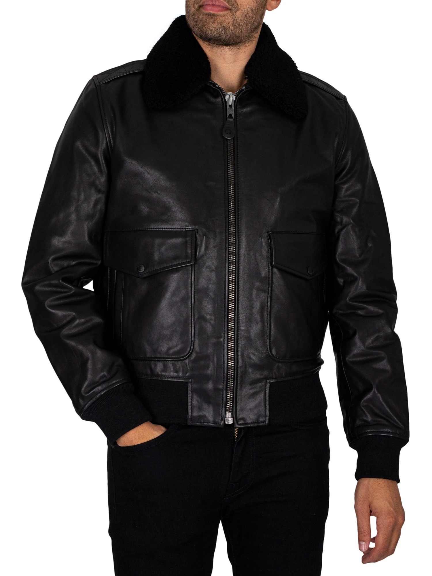 The Leather Double Bomber Jacket from Schott comes with buttoned pockets and inner removable light jacket, featuring elasticated cuffs and hem. Coming Black colour, this jacket features a detachable faux fur on collar.