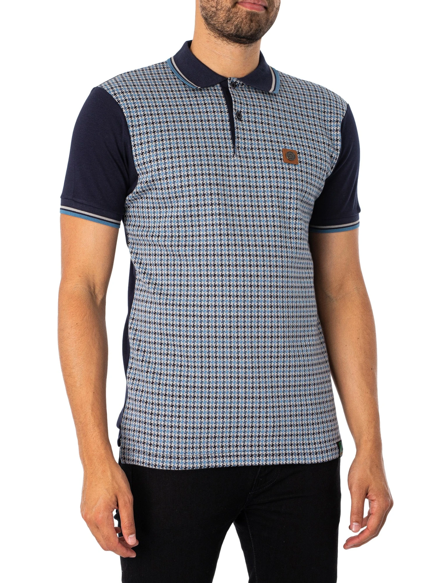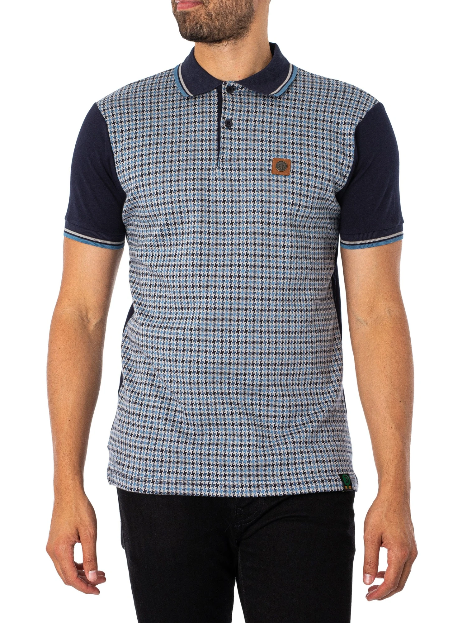 The Houndstooth Panel Polo Shirt from Trojan comes in Navy colour, featuring a metal logo. Coming with a two-buttoned placket and short elasticated sleeves, this polo features a straight hem with tag.