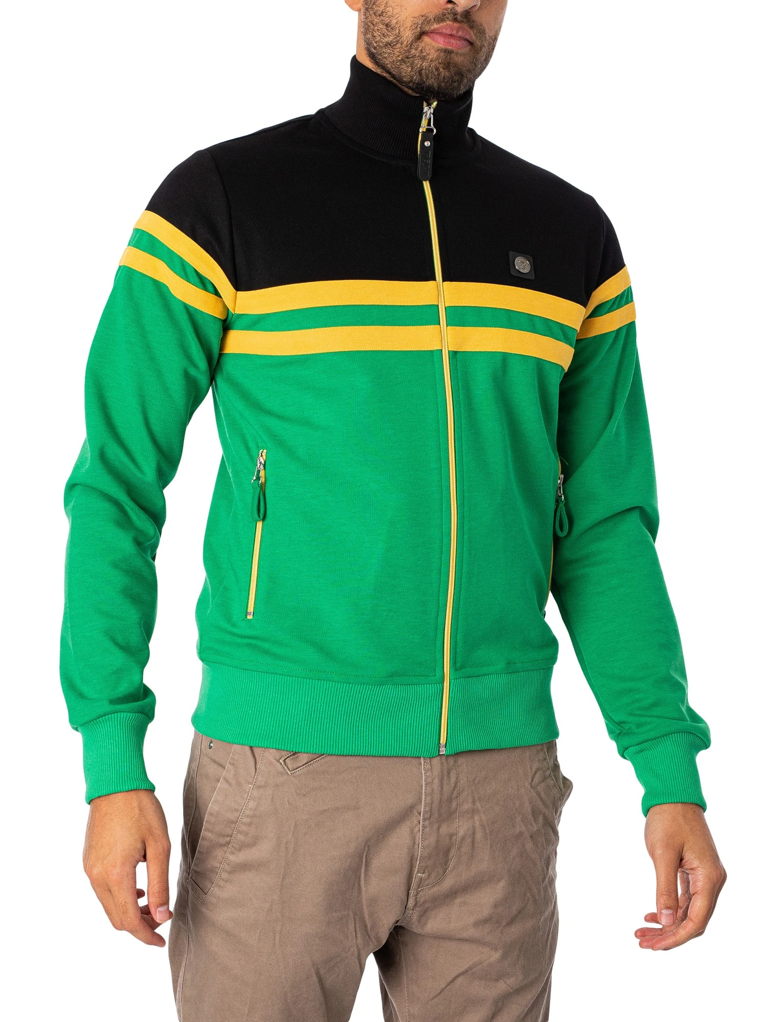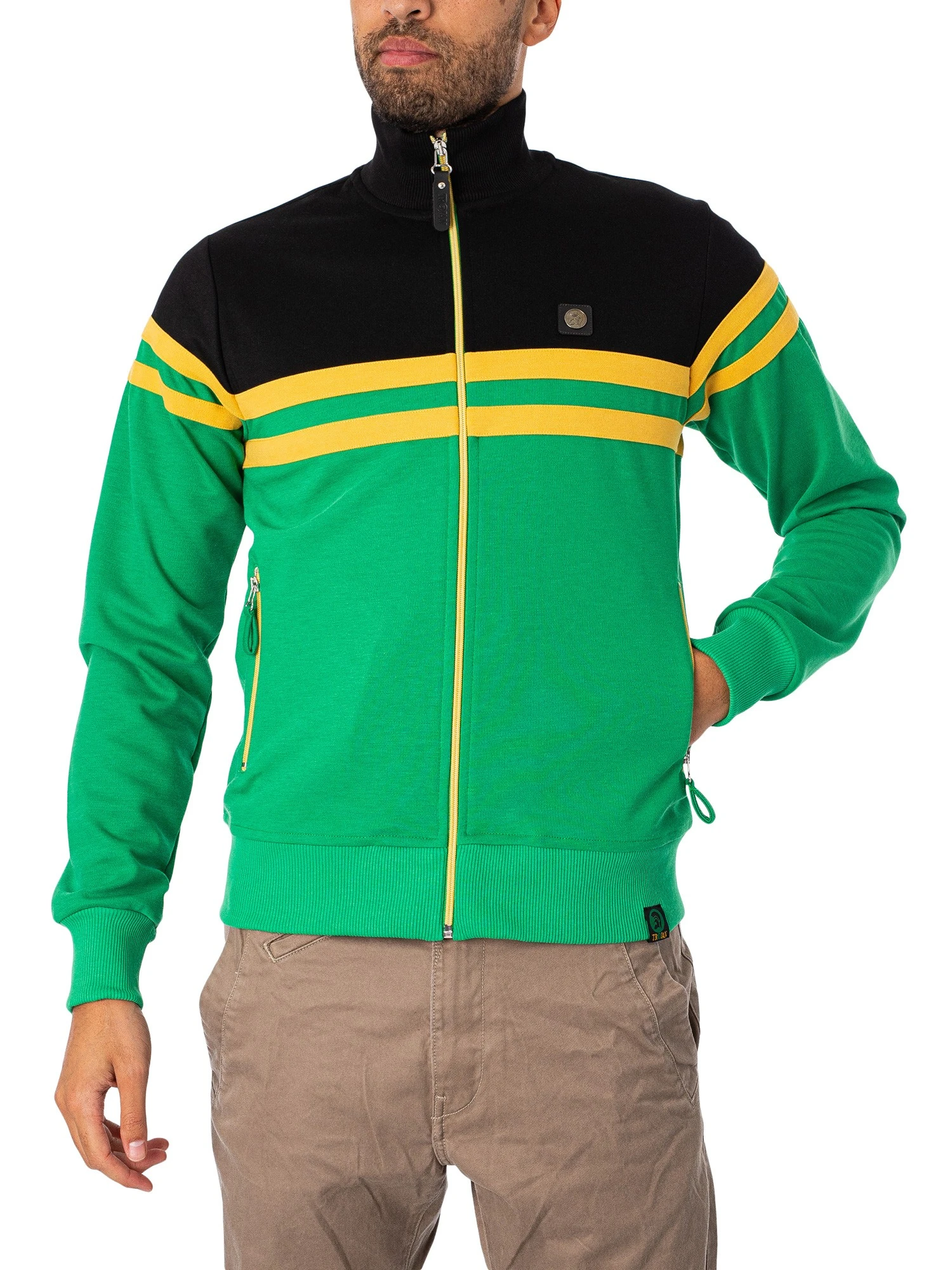 The Logo Track Jacket from Trojan comes with a logo on chest, featuring zip pockets and a branded tag on hem. Coming in Jamaica colour, this jacket features elasticated collar, cuffs and hem.